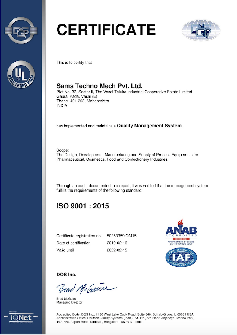 Ensure that the products manufactured meet stringent quality standards needed in pharmaceutical ,cosmetics ,food and confectionery industry to eventually serve mankind effectively and make it a "Way of life" at Sam.